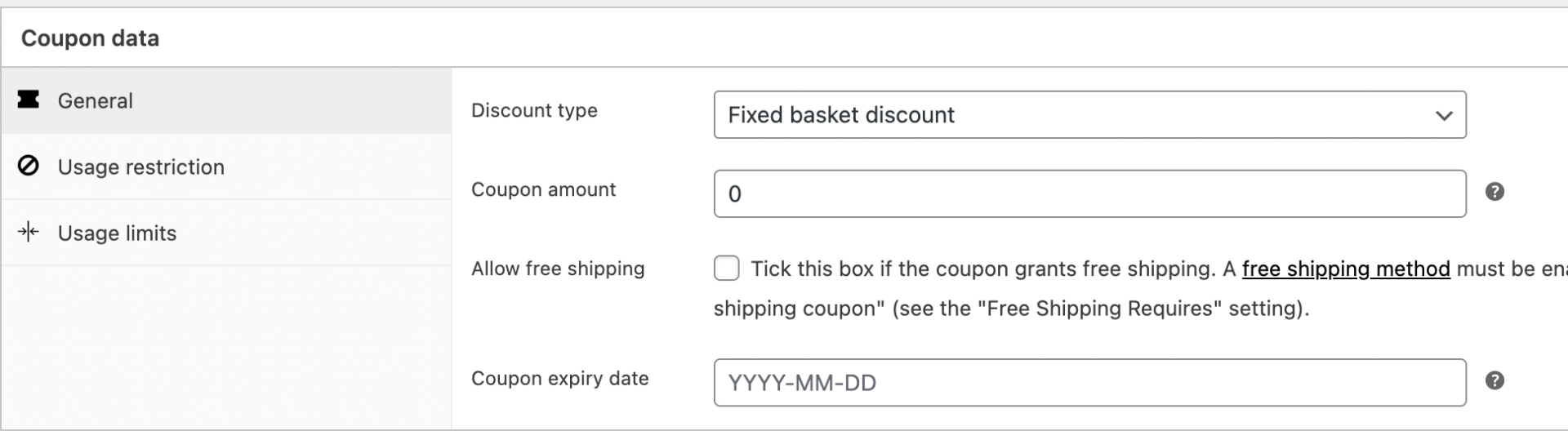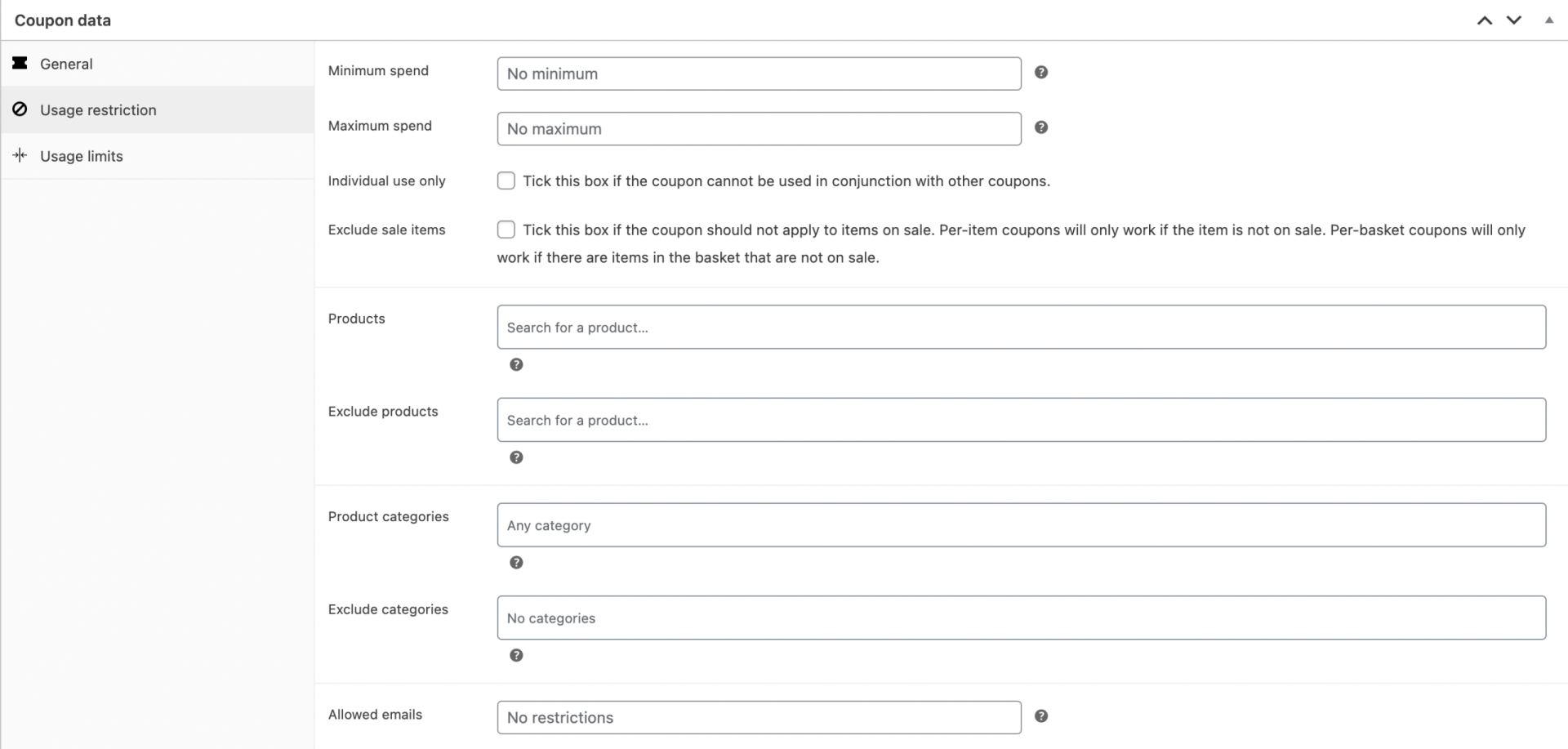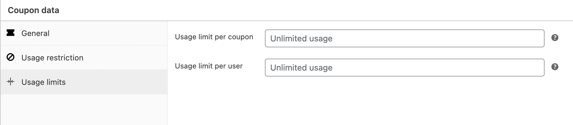 Under Coupon Data, there are three sections that you can use to add restrictions and limits for the coupon: