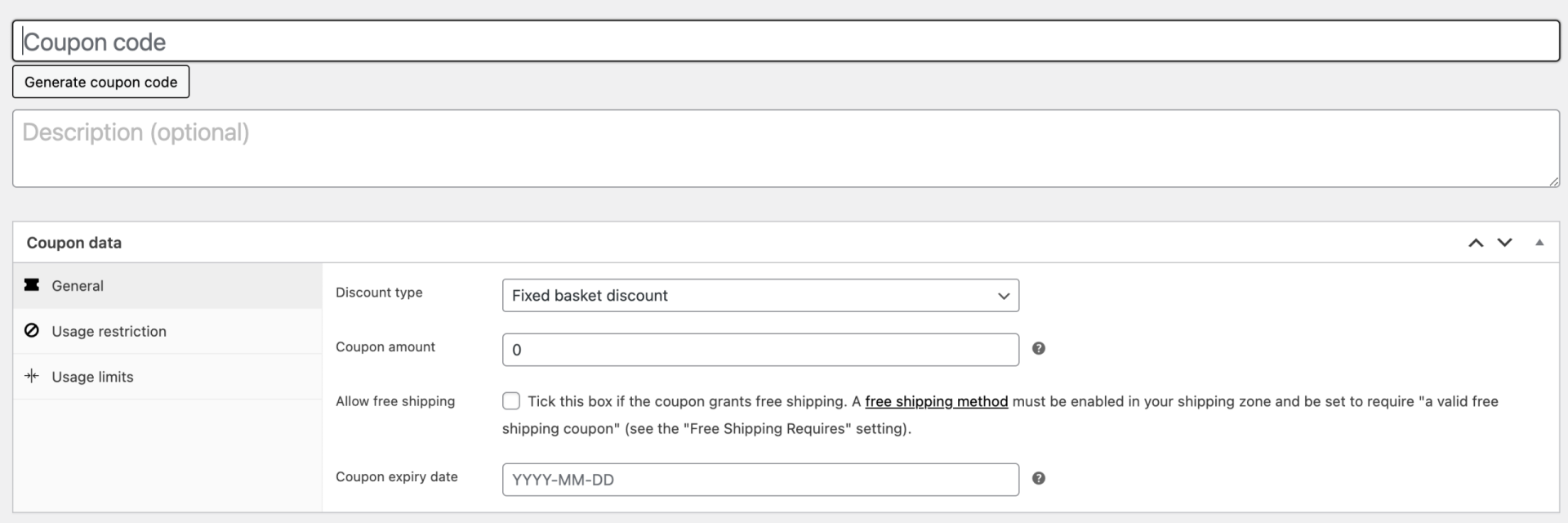 - Coupon code: code used by the customer to apply the coupon. It must be unique, as it is used as an identifier.